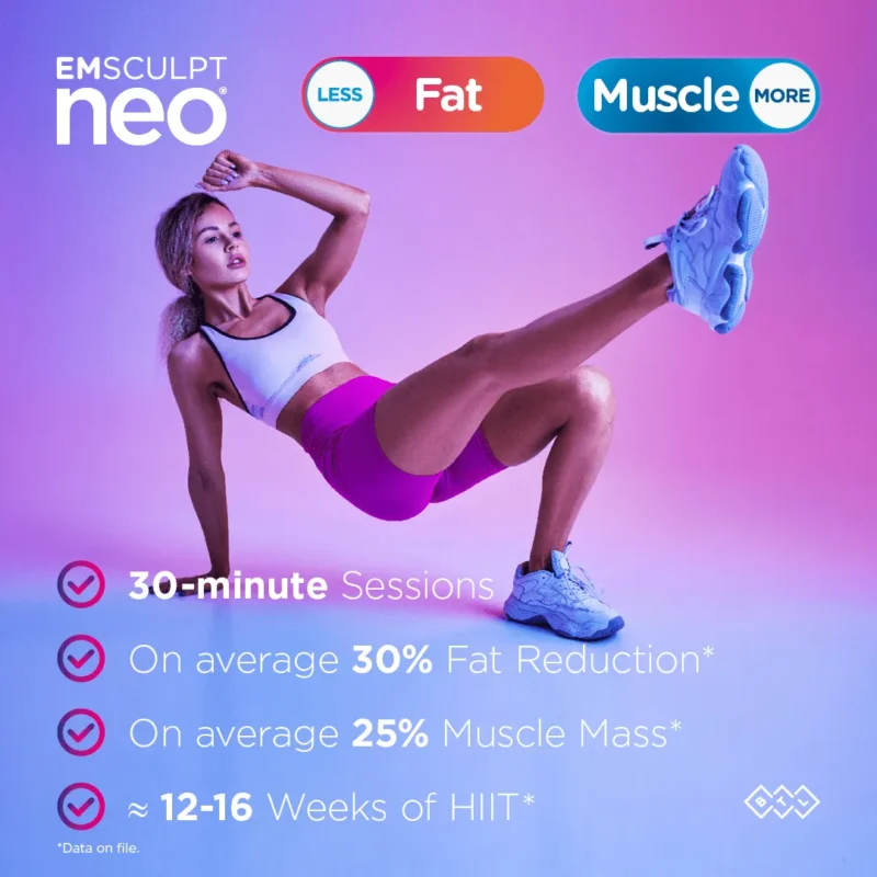EMSCULPT NEO is an advanced body sculpting treatment that combines two technologies – HIFEM+ (High-Intensity Focused Electromagnetic) and RF (Radio Frequency) – to simultaneously build muscle and burn fat. This unique technology can help you achieve up to 25% more muscle mass and 30% less fat in the treated area.
